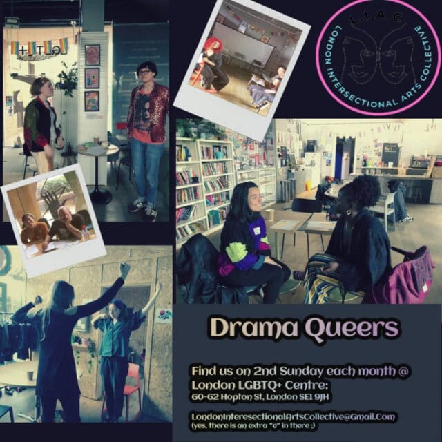 Drama Queers meet every second Sunday of the month to explore different methods of performance at London LGBTQ+ Community Centre. For more details visit https://www.eventbrite.co.uk/e/dramaqueers-tickets-491743978477