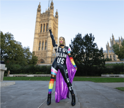 Trans artist and viral sensation, Mila Jam (she/her), made a stand outside one of the most recognisable locations in the world today with a powerful message: ‘Stop Killing Us’. The message draws attention to transphobia and offers a response to the rising rates of trans femicide around the world. Transphobic hate crimes have quadrupled over the last 5 years in the UK according to the *BBC (The BBC itself is at the centre of a row over transpobia).