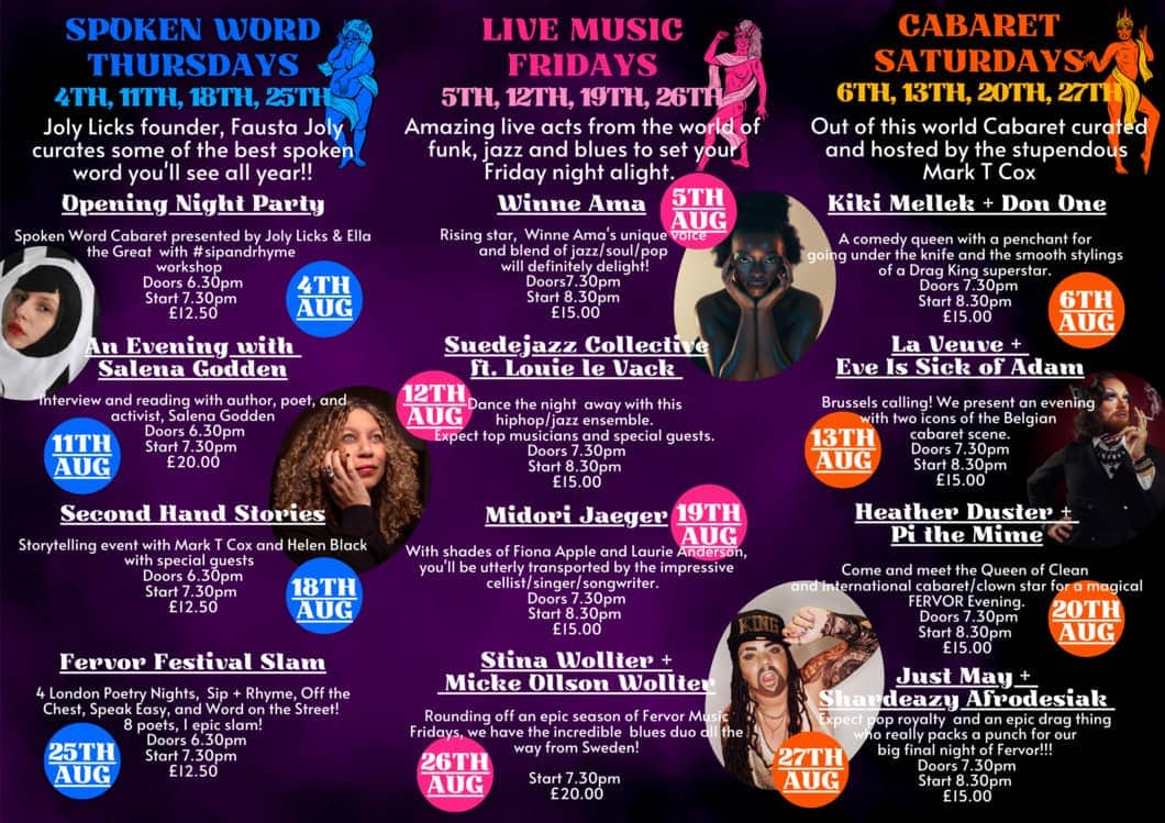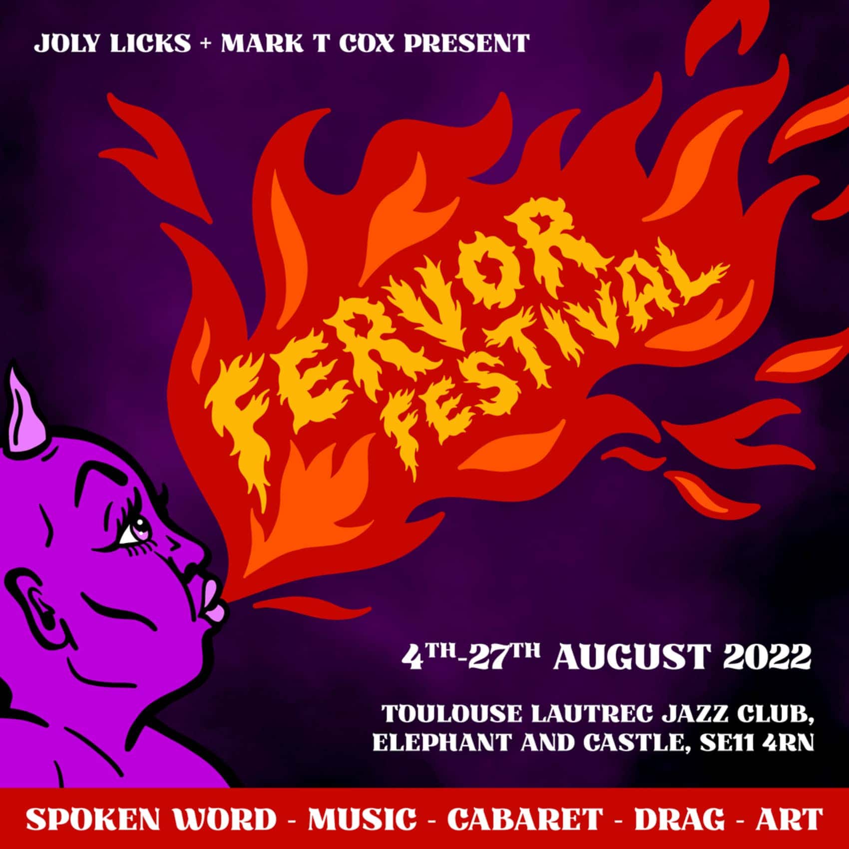 Come and join the Fervor this August. Toulouse Lautrec, Jazz Club (Parliamentary Jazz Award Nominee 2022) hosts an amazing four-week festival celebrating the worlds of Spoken Word, Live Music, Cabaret, Queer Art + Drag – with comedy and film matinees to boot! Brought to you by producers Joly Licks and Mark T Cox – their aim is to Burn UP not Burn OUT! Celebrating the amazing creatives in our fair city, they’re turning up the heat.