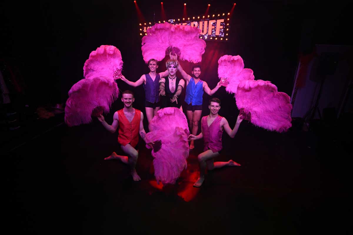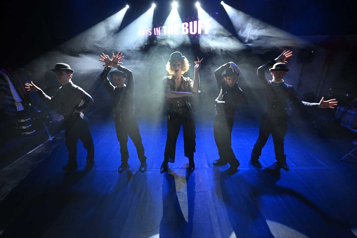 Rowan Armitt-Brewster, Adam Norton, Liam Bradbury, Max Rizzo, and Tish Weinman perform in the musical comedy Boys in the Buff.