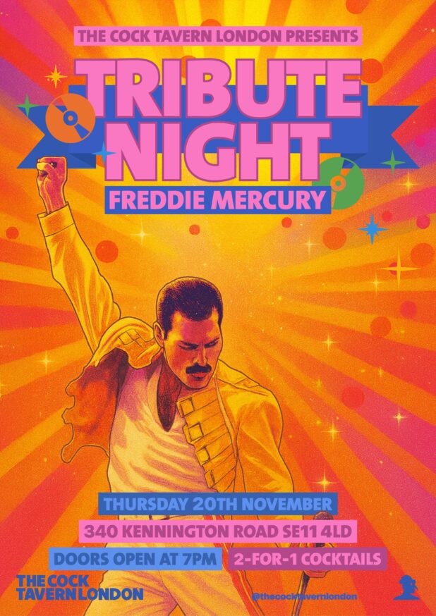 The Freddie Mercury Tribute Night is on Thursday 20 November, 2025 (7pm – 11:30pm), The Cock Tavern, 340 Kennington Rd, London SE11 4LD, United Kingdom.