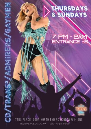 A wonderfully friendly and popular basement bar for gays, trans and tvs. It’s a friendly mix and very cruisy. You might call it old school, which is all part of the charm. Today: TV/TS/Gay/Admirer Night. 7pm-2am. 305A North End Road, Fulham, London, United Kingdom, W14 9NS Nearest Tube: West Brompton.